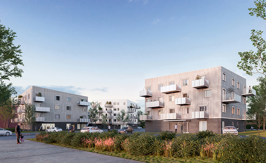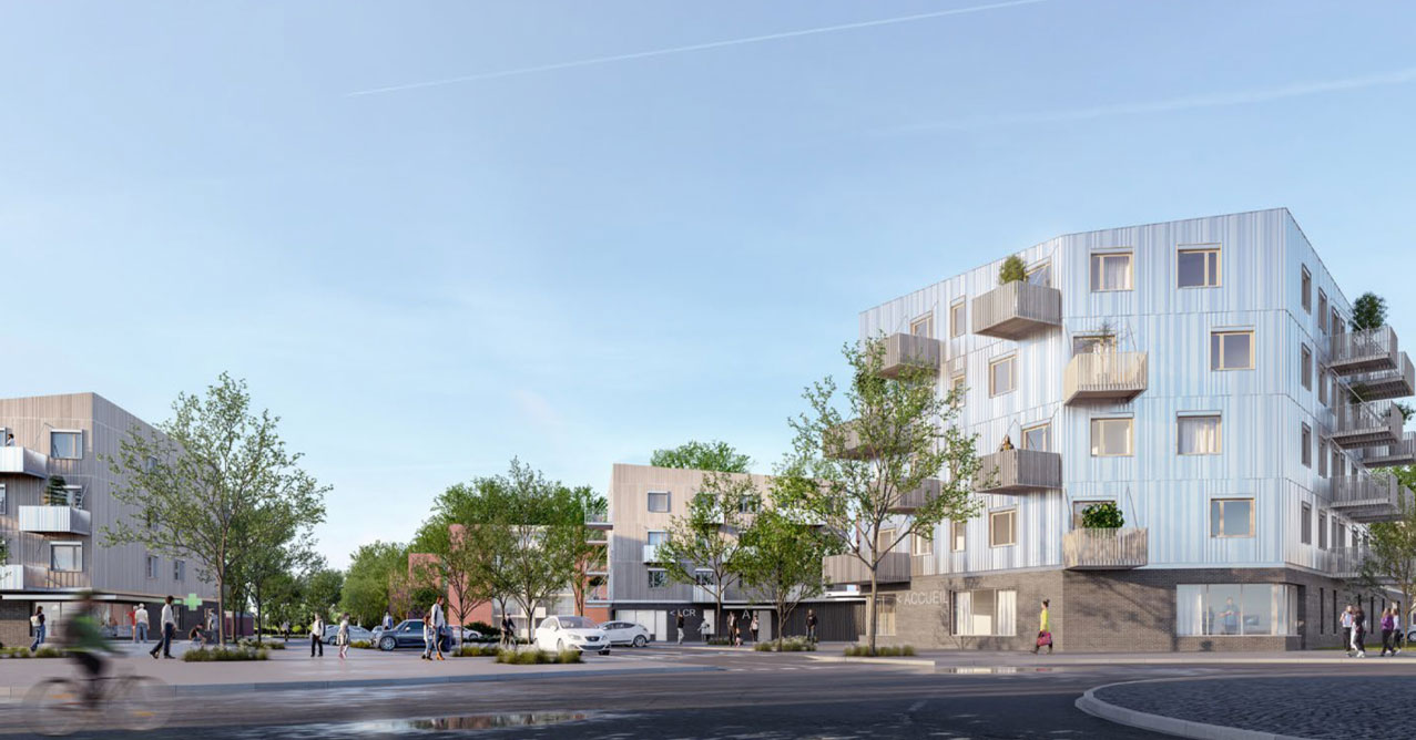 Qualifier la façade du quartier sur l’entrée de Ville en reprenant l’écriture architecturale du site en bâtiment-plots, affirmation de l’alignement urbain sur l’avenue principale, ouverture des rdc sur l’espace public requalifié, intégration de la brique présente sur le bâti existant en façade des RdC.