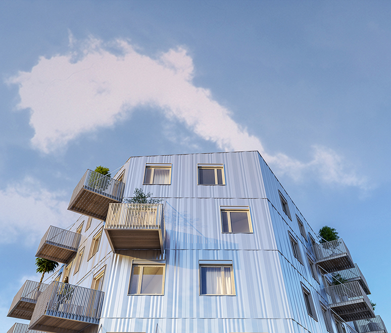 Quartier prioritaire en politique de la Ville de 650 logements, résidentiel social années 50/60 en limite communale sur la forêt domaniale de Ferrière, restructuration urbaine et densification – RER zone 5. Bâtiments plots alignés sur l’avenue principale multi-orientés. Construction de 63 logements collectifs (3 bâtiments), 1LCR, 1 loge centrale, 1 local commercial. Qualification de la façade du quartier sur l’entrée de Ville. Construction en filière sèche complète en technique ossature bois et planchers à solivage à petite section sur sommiers, chapes anhydrites. Cage d’ascenseur en CLT. Socle à RdC en béton. Murs finis d’usine intégrant les menuiseries extérieures, le bardage, les isolants, la serrurerie. Balcons sur tirants préfabriqués. Bardages bois prégrisaillés, bardage métallique et double mur brique à RdC. 3 traitements différenciés des bâtiments en isolation et inertie relative : laine de verre vs fibre de bois, 2xBA18 en doublage vs 1xBA18. Bâtiment en conception Passiv Haus équipé d’une ventilation double flux à récupération de chaleur, raccordé sur puit canadien hydraulique en rafraichissement. Pas de radiateur en logements (menuiseries triple vitrage). Toitures terrasses « cool roof ». Stationnements extérieurs perméables. Gestion des EP à la parcelle (noues), végétalisation de façade, label Eco-jardin et BiodiverCity (site classé en ZNIEFF et réservoir de biodiversité). Projet Pilote Confort d’été (CECOB – APR ADEME). Création d’un refuge climatique (LCR).
